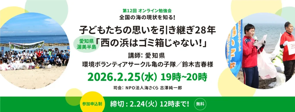 年間で1000人が参加する愛知県 渥美半島の西の浜クリーンアップ活動を中心に、海ごみの現状や、スナメリ観察会、磯遊びの会、スノーケリングの会、タッチングプール、塩づくりの会など、多岐に渡る活動についてお話を伺います。
